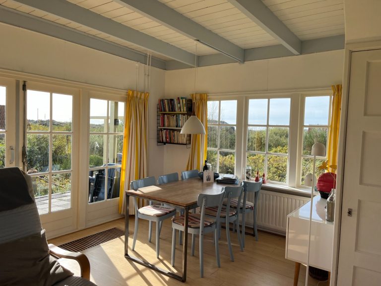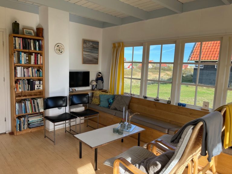 Vanuit de lichte woonkamer heb je een prachtig uitzicht op de duinen en op de avondluchten bij zonsondergang en vanuit de openslaande deuren kom je op het heerlijke beschutte terras op het zuiden.